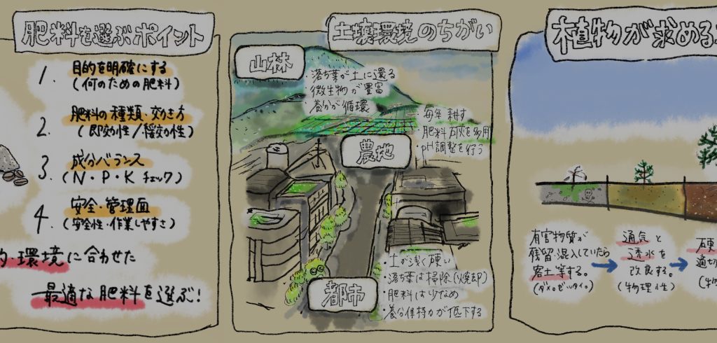 土壌は「物理・化学・生物」の三位一体で理解し、そして都市の土壌には「硬い・狭い・浅い」「有機物が少ない」といった特徴がある――これは講義の中で繰り返し強調されたポイントです。だからこそ、従来のように肥料を撒くだけでなく、土を耕し、必要な資材を施し、微生物を育てるといった総合的な土壌ケアが求められます。化成肥料が悪で有機が善という単純な話ではなく、それぞれのメリットを理解した上で適材適所に活用することが重要です。また、限られた植栽空間であっても諦めず、創意工夫でできることはたくさんあります。今回学んだ知識をチーム内で継続的に共有し、実践していくことが、持続可能な都市緑地管理につながると信じています。