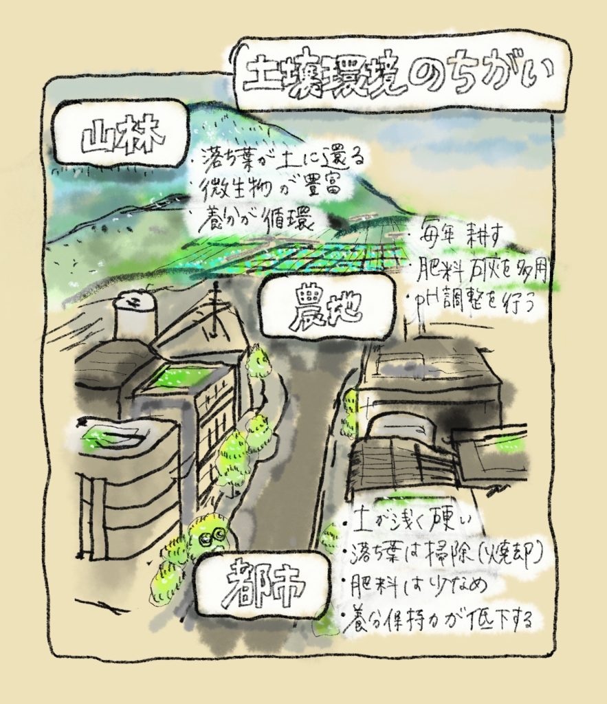 これは非常に興味深いテーマです。結論から言えば、「不可能ではないが、放置するだけでは難しい」というのが回答です。例えば落ち葉を残しておくだけではなく、前述のように微生物資材を投入したり、場合によっては土を軽く耕して根が広がりやすい環境を作ったりするなど、人の手で自然を手助けする必要があります。山林では何十年、何百年という長い時間をかけて土壌ができあがり、生態系が成熟していますが、都市の植栽地は人が造成してから日が浅く、周囲の環境(温度や大気環境、人為的な攪乱など)も全く異なります。そのため同じようにいくことは難しいですが、緑地を小さな生態系と見立てて根と土と微生物の関係に配慮した管理をすれば、限られた範囲でも循環を生み出すことは十分可能です。